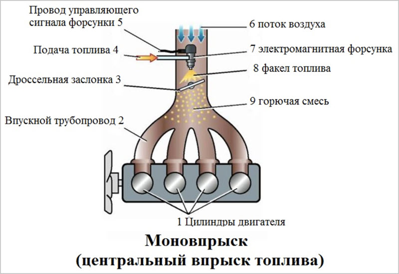 Ее устройство включает всего одну форсунку, которая отвечает за подачу бензина в общий впускной коллектор для всех цилиндров.