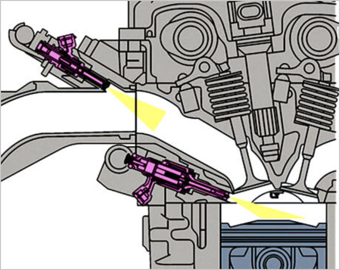 В этих топливных системах инжекторы устанавливаются прямо в головке блока цилиндров, что позволяет бензину поступать в цилиндр напрямую, минуя впускные клапаны и коллекторы.