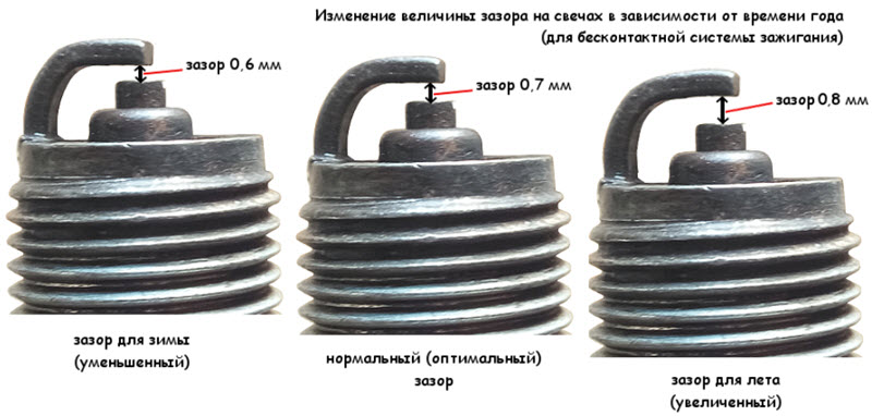 Рекомендуется уменьшать зазор до нижнего предельного значения или чуть ниже. Например, для свечей зажигания, применяемых в бесконтактной системе зажигания двигателя автомобилей ВАЗ, рекомендуемый зазор составляет 0,7–0,8 мм. Зимой можно установить расстояние в 0,7 мм, а летом — 0,8 мм.