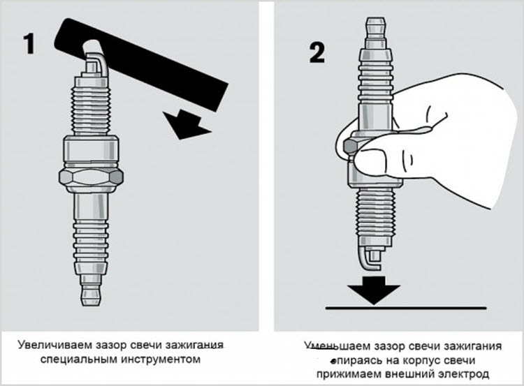 Для этого применяется специальный инструмент, который позволяет аккуратно подогнуть боковой электрод на нужное значение. Зазор измеряется с помощью щупа, предпочтительно круглого сечения.
