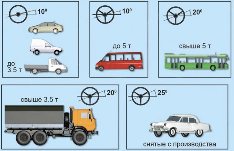 Например, если рассмотреть одно из самых «люфтящих» семейств автомобилей, таких как вазовская «классика», то заводские технические условия ограничивают суммарный люфт в 5 градусов, в то время как по техническому регламенту страны он может составлять не более 10 градусов для всех легковых автомобилей.