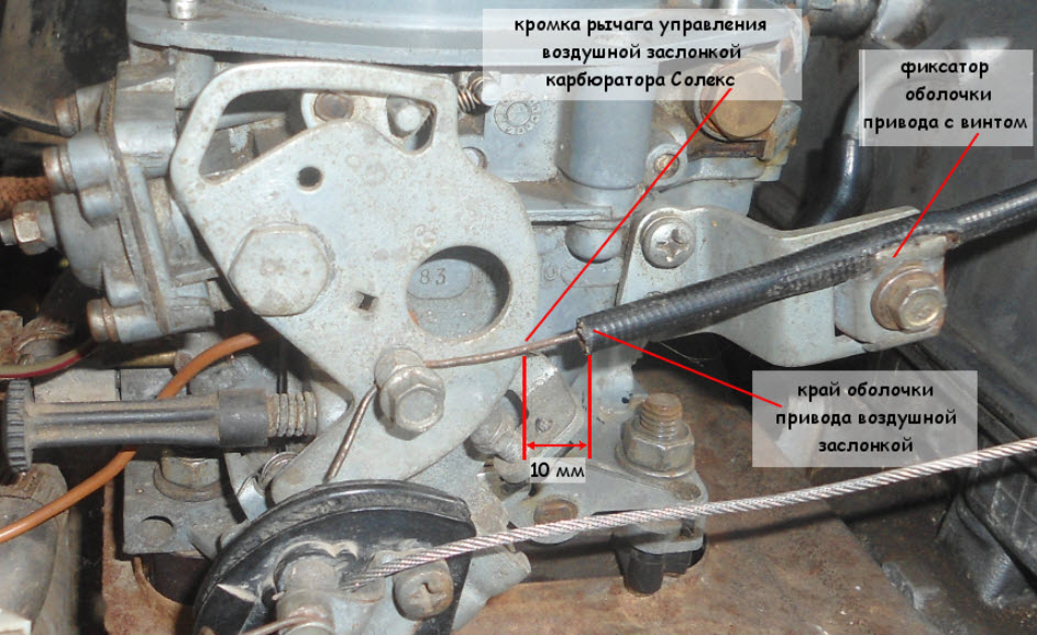 Регулировка пускового устройства выполняется путем изменения положения оболочки троса на кронштейне, чтобы заслонка полностью открывалась и закрывалась в крайних положениях кнопки подсоса.