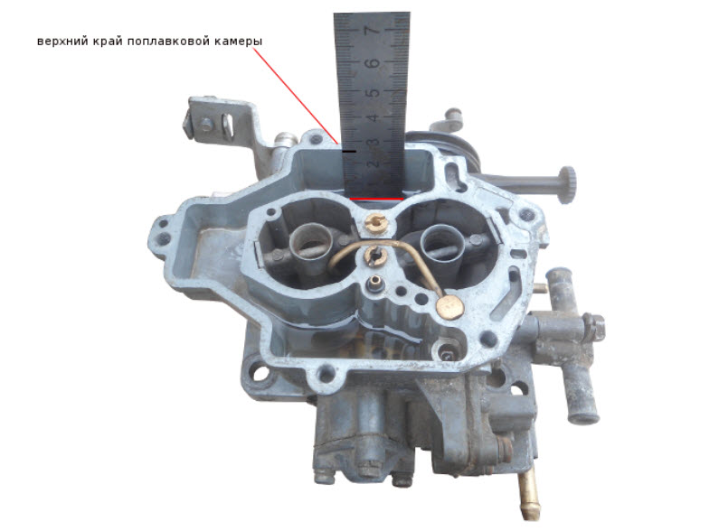 Уровень топлива в поплавковой камере устанавливается так, чтобы при перевернутом и горизонтально расположенном верхнем элементе карбюратора зазор между поплавками и прокладкой составлял около 2 мм. После этого уровень можно проверить, установив крышку, запустив двигатель, затем заглушив его и сняв крышку; расстояние от бензина до фланца должно быть примерно 24 мм.
