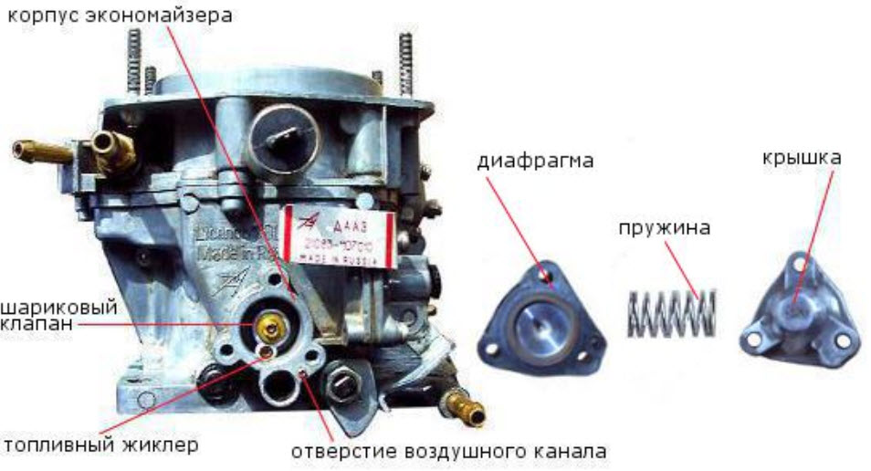 | Экономайзер мощностных режимов (ЭМР) | Дополнительное обогащение смеси при максимальных нагрузках | Подбор жиклера, регулировка пружины |