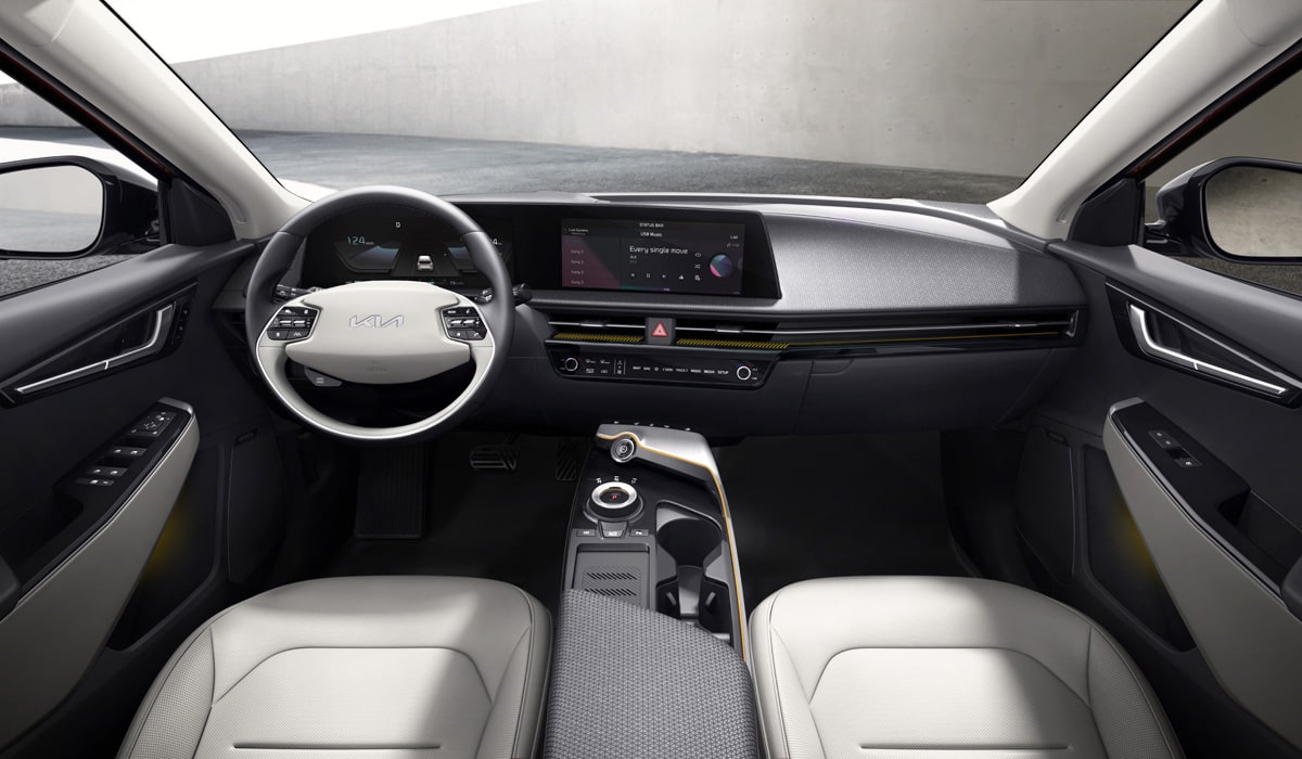 Интерьер Kia EV6 отличается простотой и элегантностью. Приборная панель выполнена в минималистичном стиле, за исключением крупного информационно-развлекательного экрана и цифрового дисплея, предназначенного для водителя и пассажиров. Система климат-контроля не является полностью автоматизированной и включает в себя физические элементы управления.