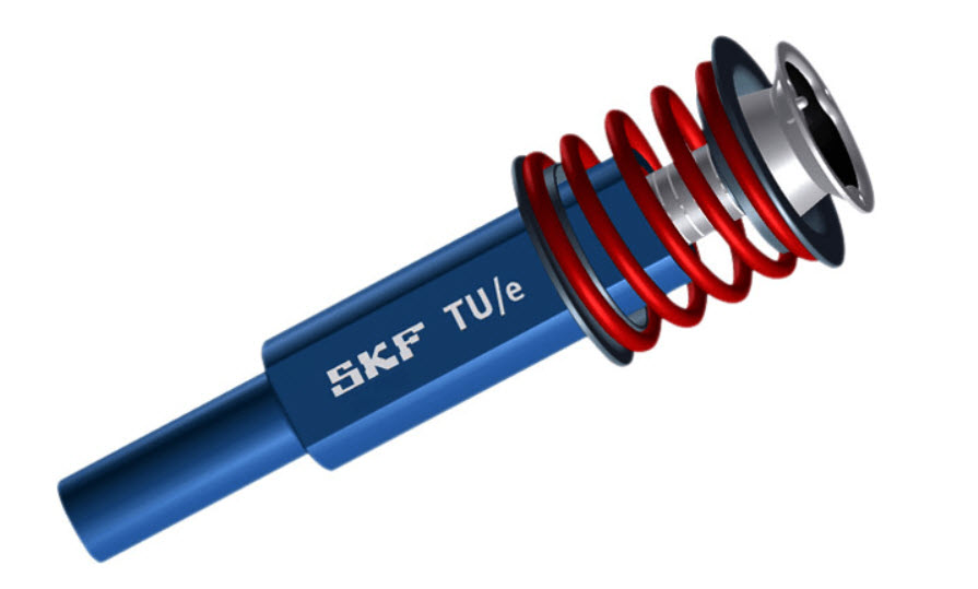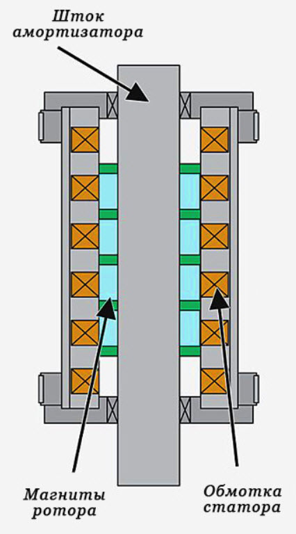 Однако на самом деле общее между ними лишь использование устройства, которое можно рассматривать как линейный электродвигатель. В сравнении с разработкой компании SKF, количество полюсов электромагнитов здесь значительно увеличено. Они размещены на штоке и статоре устройства, которое напоминает телескопический амортизатор.