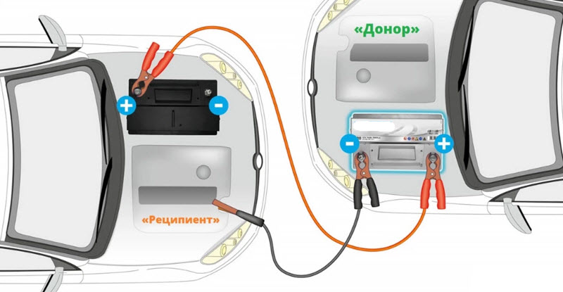 Клеммы аккумулятора донора следует подключить к массе и положительному выводу неподвижного автомобиля, строго соблюдая меры предосторожности.