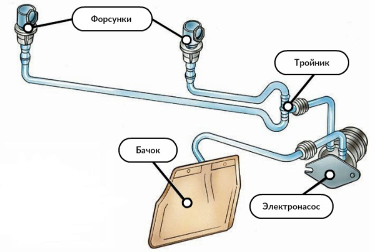 - трубопроводы и форсунки можно продуть, сняв пластиковый шланг с насоса; на пути к форсункам могут находиться клапаны и тройники;