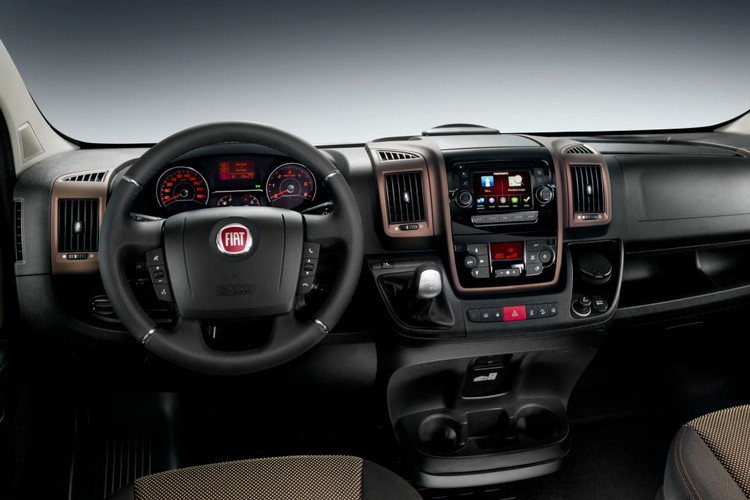 Торпедо Fiat Ducato отличается строгим дизайном. Его выделяют коричневые пластиковые вставки на дефлекторах воздуховодов, придающие интерьеру изысканности. Удобный пухлый обод рулевого колеса приятно держать в руках, а на самом руле расположены кнопки управления мультимедийной системой.