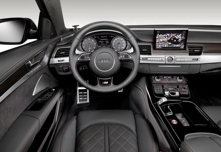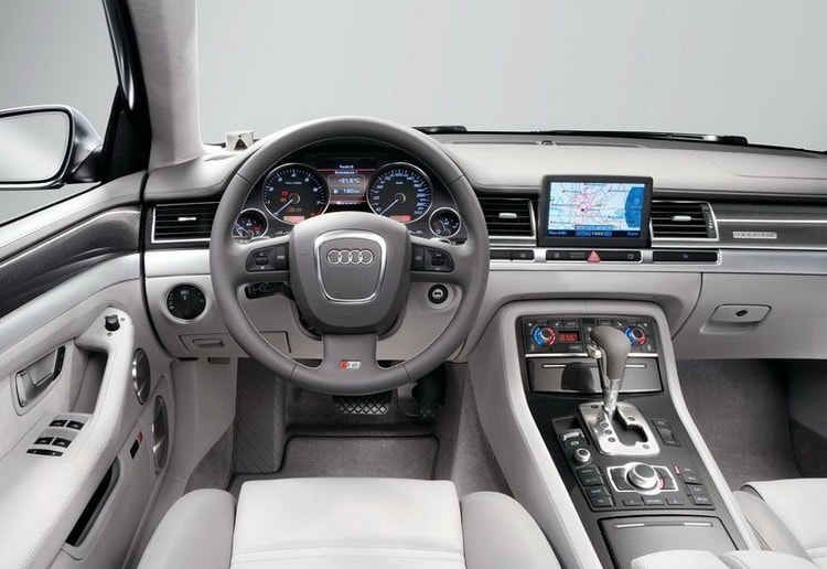 Интерьер автомобиля украшен алюминиевыми акцентами на торпедо, а центральный тоннель выполнен из темного дерева. На трехспицевом рулевом колесе можно заметить букву «S8». Приборная панель, как и принято, имеет серый фон, что делает шкалы спидометра и тахометра более заметными.