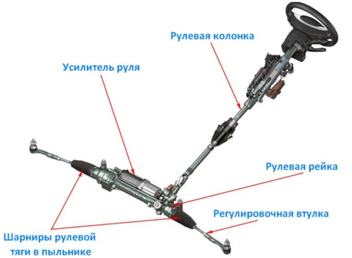 Чаще всего отчетливые постукивания исходят от рулевого механизма и трапеции. В большинстве случаев это система, состоящая из рейки, расположенной в корпусе, тяг с шарнирами и наконечников, соединенных с поворотными рычагами.
