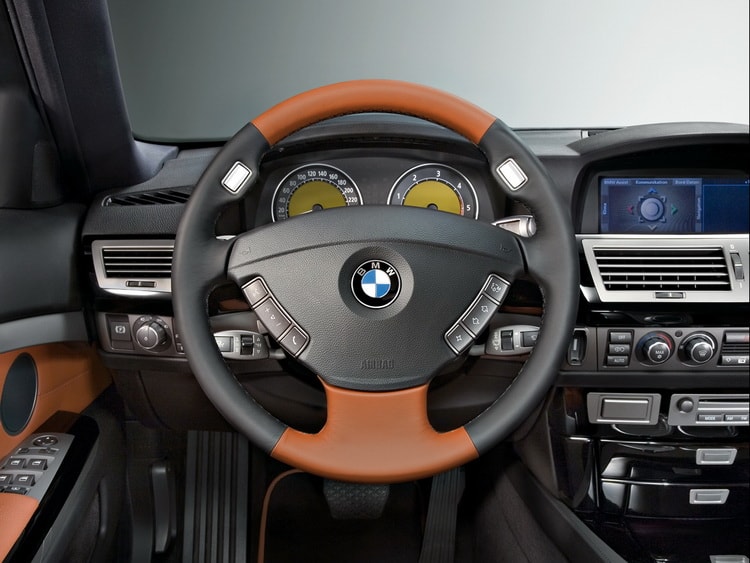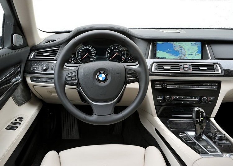 Салон автомобиля напоминает роскошный офис: здесь много кожи, деревянных элементов и алюминиевых деталей. При этом он отличается высокой функциональностью и удобством. На центральной консоли выделяется крупный экран системы iDrive, который управляет множеством настроек и функций. На дисплее отображается изображение с камеры заднего вида, навигационные карты, телевидение, а также параметры шасси и бортовой электроники.