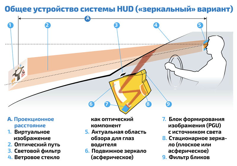 | Преимущества | — Повышает безопасность: водитель не отвлекается от дороги. — Уменьшает усталость глаз: не нужно постоянно перефокусироваться. — Интуитивно понятное отображение информации. |