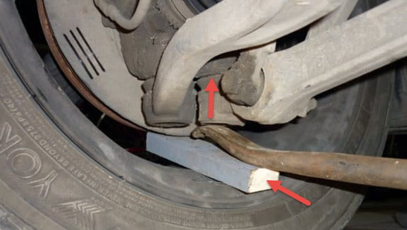 | Проверка люфта (покачивание колеса с монтировкой) | Домкрат, монтировка (или лом) | Поднимите переднюю часть автомобиля домкратом. Установите монтировку между нижним рычагом подвески и ступицей колеса (или между рычагом и кулаком). Осторожно надавите на монтировку вниз, пытаясь приподнять рычаг. Если есть люфт, вы почувствуете движение и/или услышите стук. Повторите, надавливая вверх. |