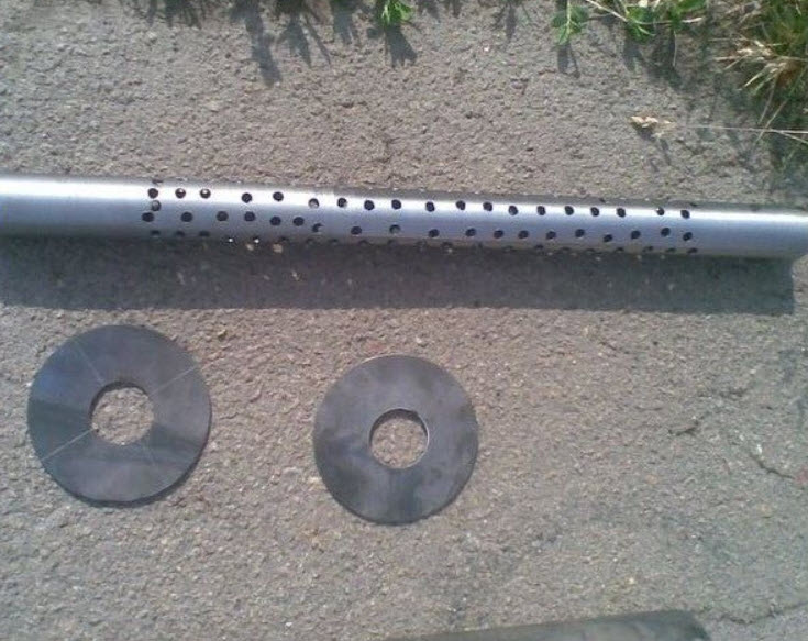 Внутренняя труба должна быть оснащена перфорацией стенки на участке, находящемся внутри корпуса. Это достигается путем сверления множества отверстий диаметром от 5 до 8 мм.