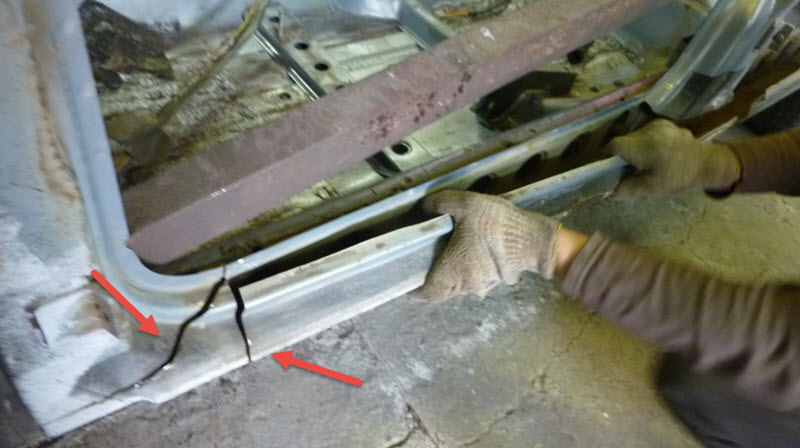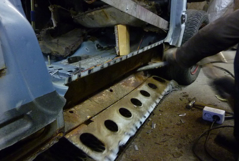 Если порог уже прогнил, но только в каком-то конкретном месте, например, перед передней аркой, то можно починить его с помощью заплатки. Для этого сперва необходимо удалить ржавчину и грязь с порога, вырезать часть порога, а затем врезать листовой металл нужной формы.