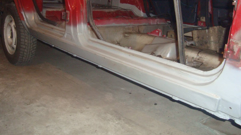 Металл слегка вдавливается внутрь, чтобы после нанесения заплат и шпатлевки можно было добиться нужной формы поверхности. После шлифовки шпатлевки порог снова грунтуется и окрашивается.