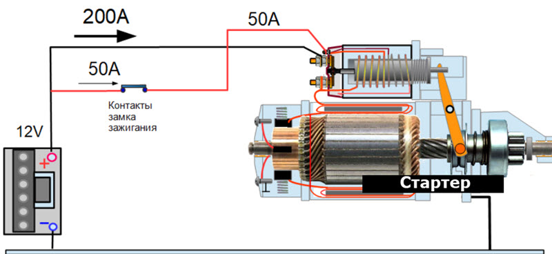 На силовом входе втягивающего реле должно быть напряжение аккумулятора, который подключен с помощью надежного провода большого сечения. Эта цепь не имеет разрывов и не защищена, так как по ней проходит ток в диапазоне 200-500 Ампер.