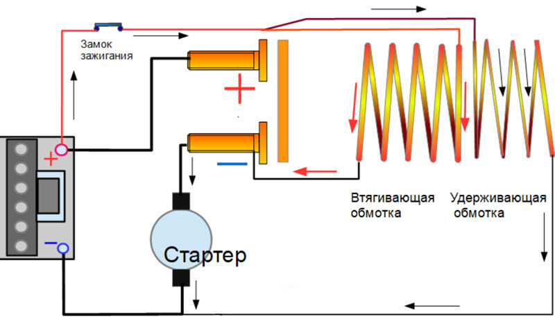 На управляющий вход втягивающего реле подается напряжение через более тонкий провод от замка зажигания, либо напрямую, либо через промежуточное реле, которое разгружает его контакты. При повороте ключа в положение «Стартер» на этой клемме появляется положительное напряжение.