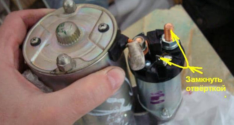 Для того чтобы все пришло в норму, необходимо замкнуть силовые клеммы стартера. Так появится возможность пустить ток на электрообмотки напрямую. Отвертка же возьмет на себя все функции тягового реле.