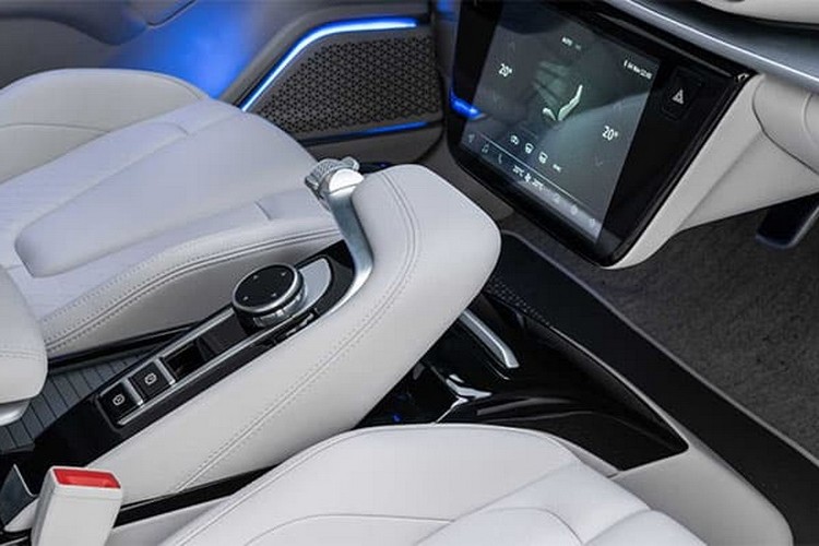 Передние сиденья выполнены в спортивном стиле, а задний диван имеет стандартную перфорацию. Завершающим штрихом являются светодиодные вставки на дверных картах, которые придают интерьеру электромобиля завершенный и современный вид.